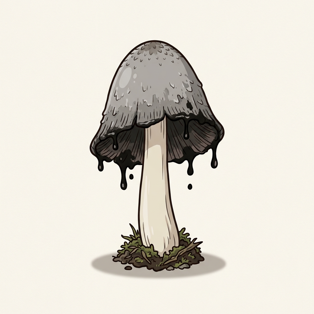 Gray inky-cap mushroom that edible on its own but contains coprine — a disulfiram-like compound that causes violent reactions (flushing, nausea, racing heart) when combined with alcohol even days after eating.
