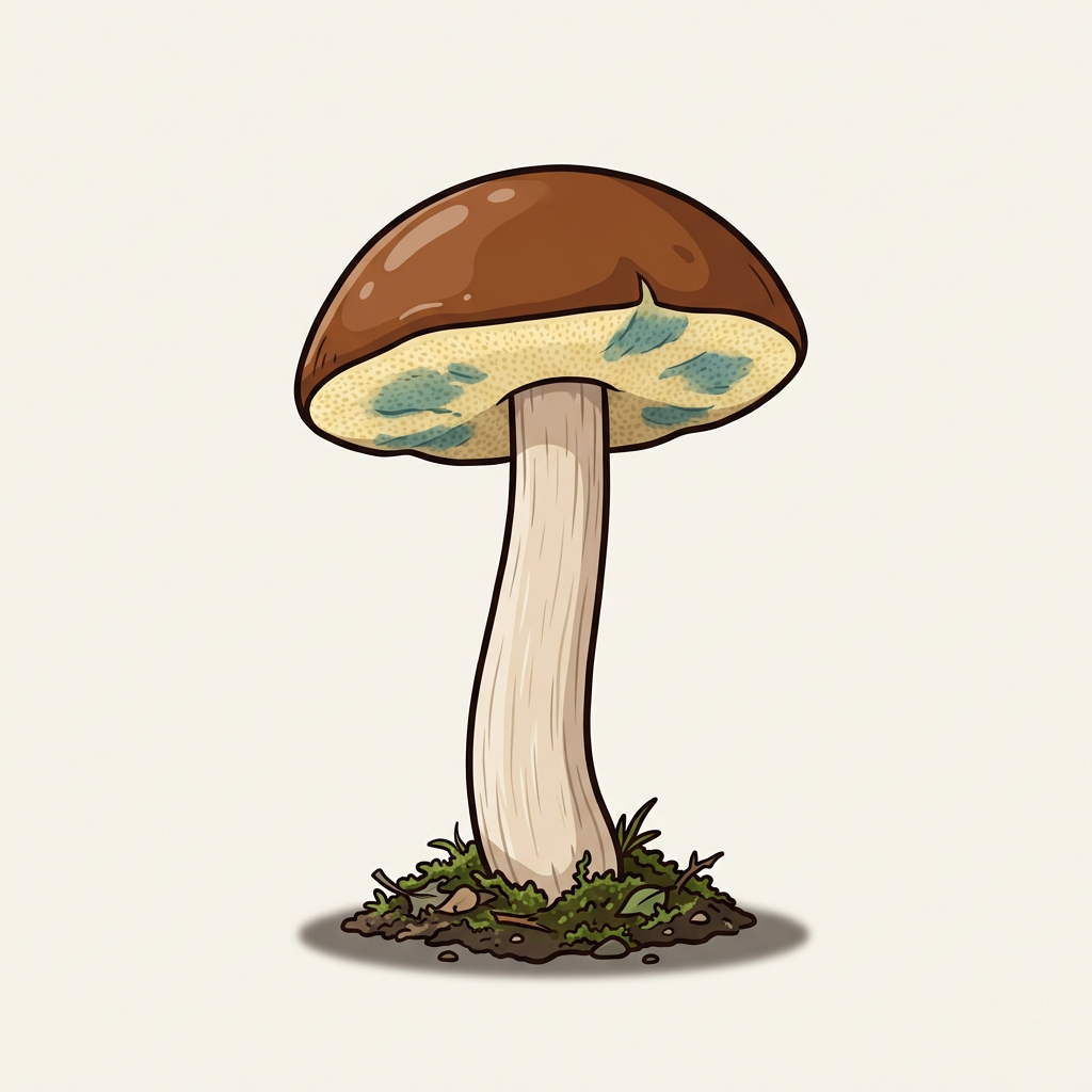 Rich chestnut-brown velvety cap, yellow pores that bruise greenish-blue. Common in European forests, found in the Pacific Northwest and Northeast. Less meaty than porcini but still excellent.