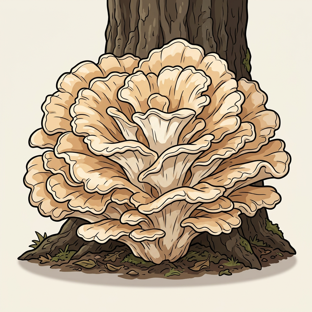 Enormous cream-colored polypore at the base of living oaks — can reach 2 feet across and 40 lb. Pleasant flavor when young; gets tough and peppery with age. A single specimen can feed many meals.