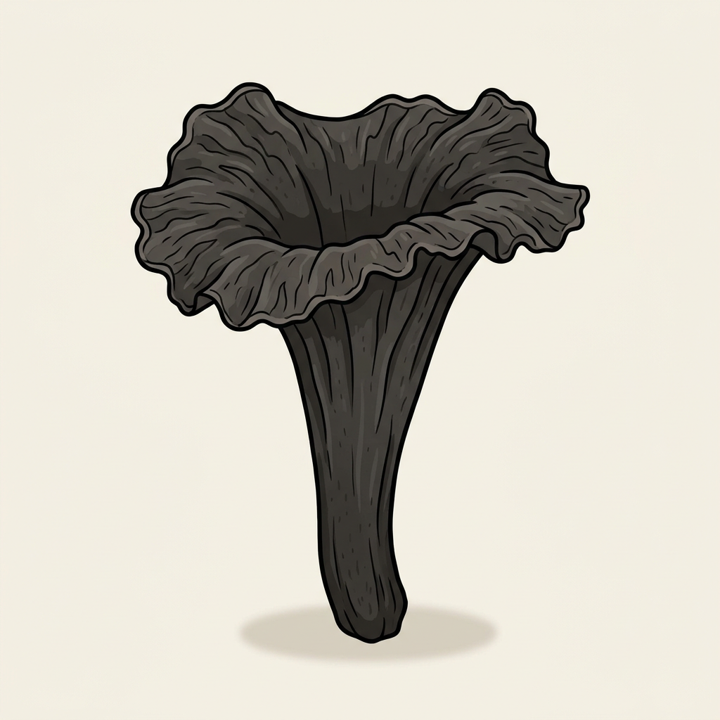 Dark gray to black funnel-shaped mushrooms that emerge from oak and beech duff. Among the most-prized edible mushrooms for their complex smoky flavor. Nearly invisible in leaf litter — the trumpets show as black holes on a gray background.