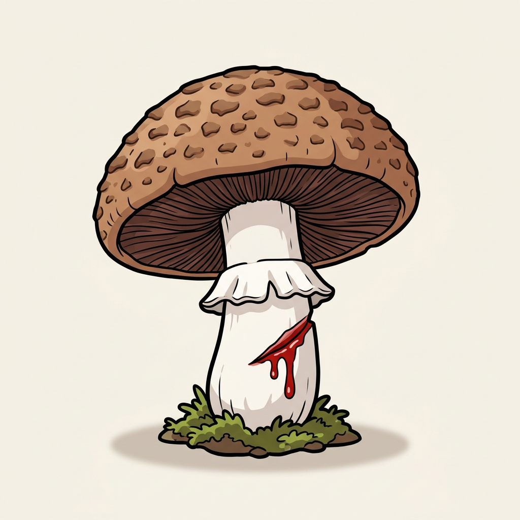 Agaricus species with flesh that stains BLOOD-RED when cut, then darkens. Includes A. haemorrhoidarius (edible for most) and several related species. Related to yellow-stainer group — careful ID required.