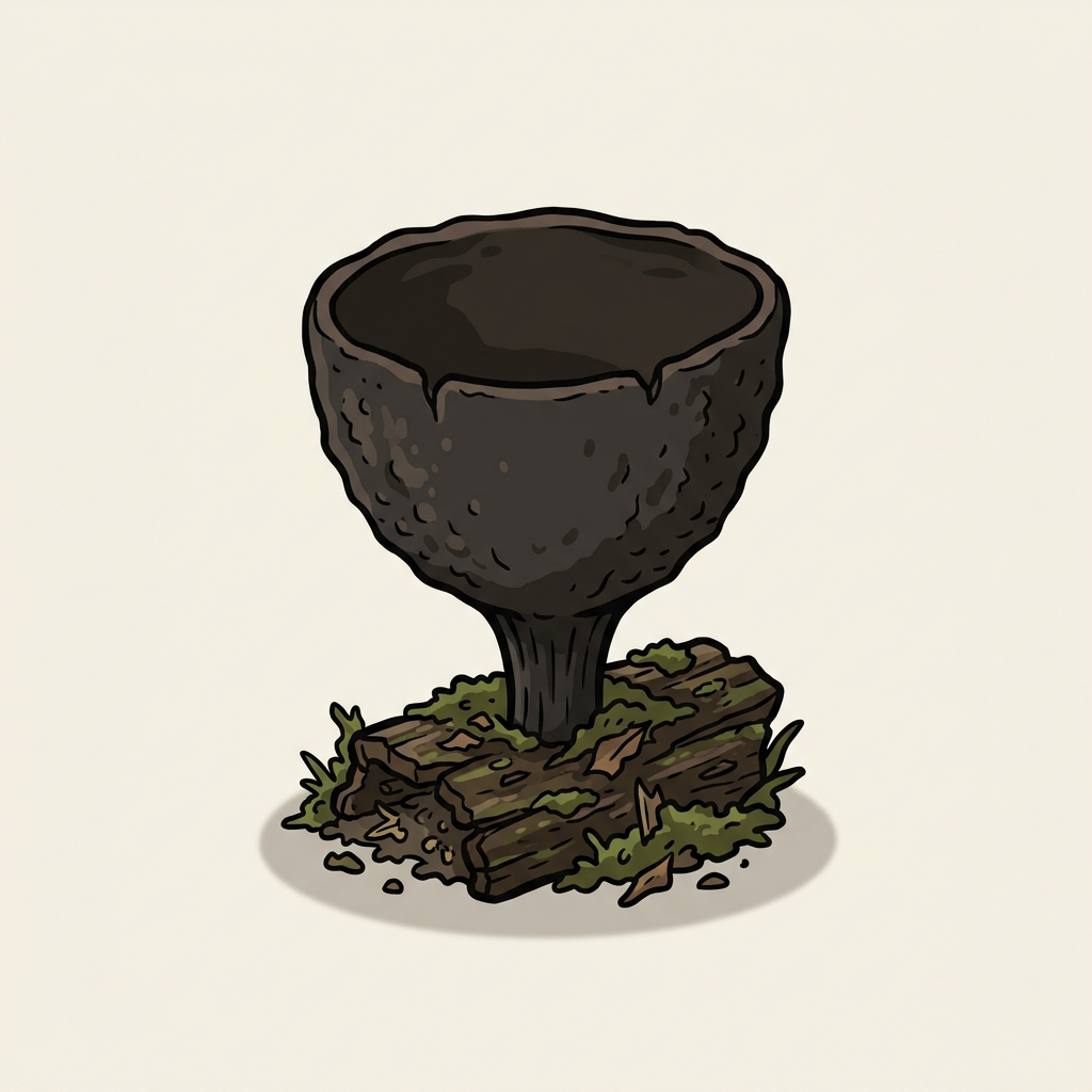 "Black leathery cup rising from a buried stick in early spring. Marks the start of morel weather."