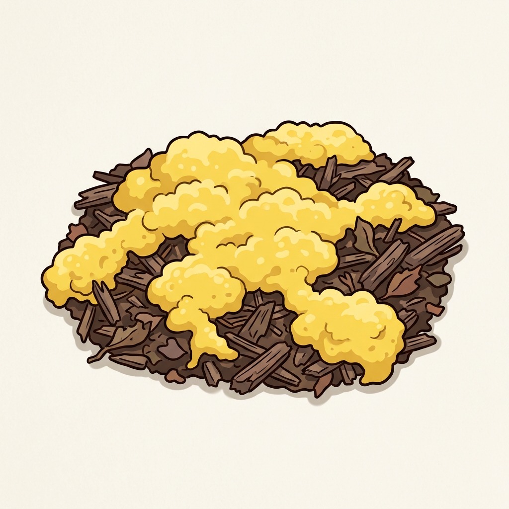 Yellow foamy slime mold that appears overnight on wood chips and mulch — looks alarmingly like dog vomit. Harmless. Photosensitive; moves slowly across substrates. Iconic example of a plasmodial slime mold.