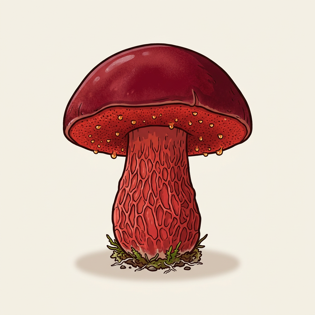 Deep wine-red cap with a bright yellow network (reticulation) on a red stem. Pores red, bruising blue. Striking but tricky — several toxic red-pored boletes look similar.