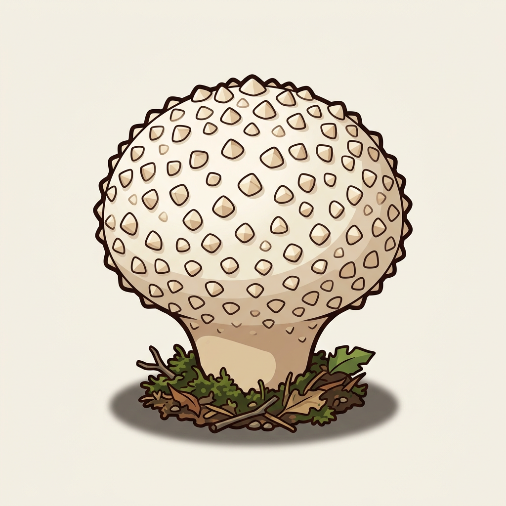 White puffball covered in pointed warty "gems" that fall off with age. Common on forest duff and disturbed ground. Edible only while pure white inside.