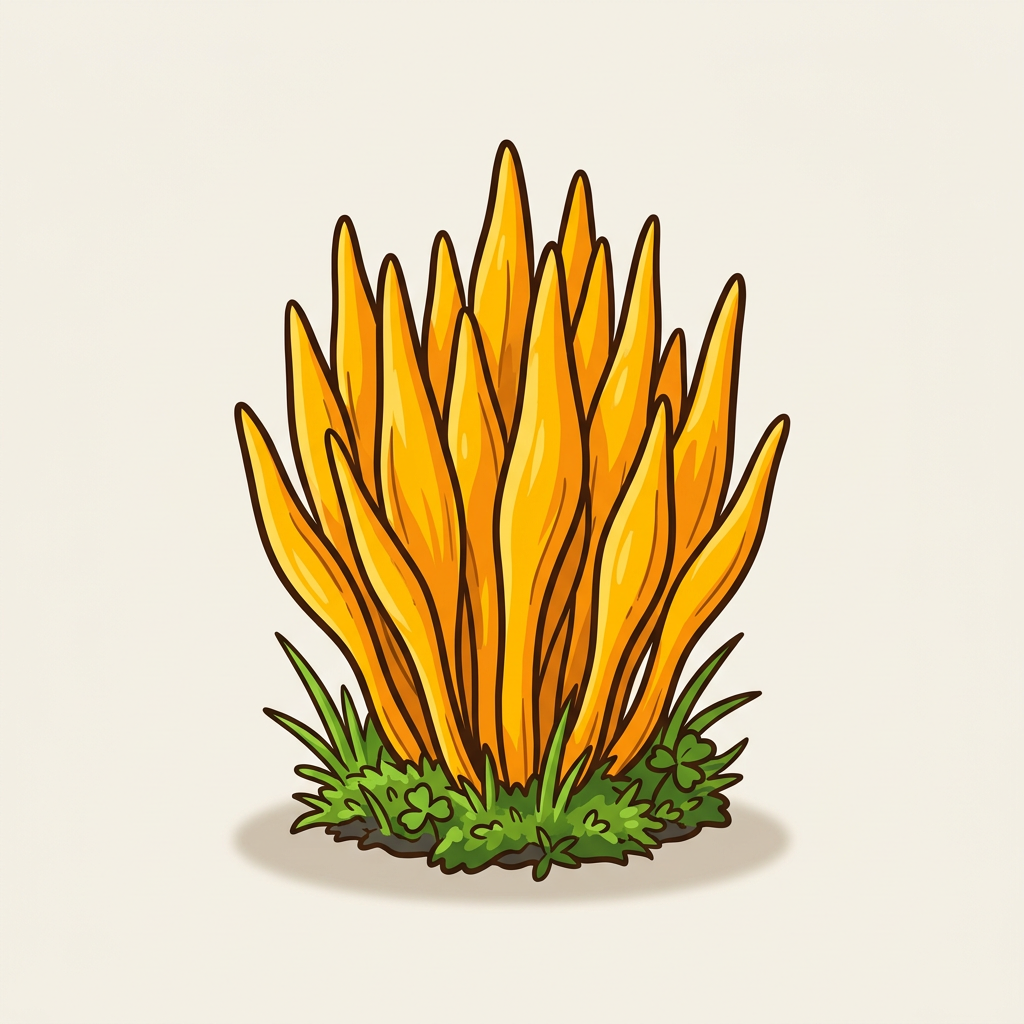 Bright yellow unbranched cylindrical "spindles" in dense clusters. Striking appearance; mild flavor. Harmless but not a culinary target.