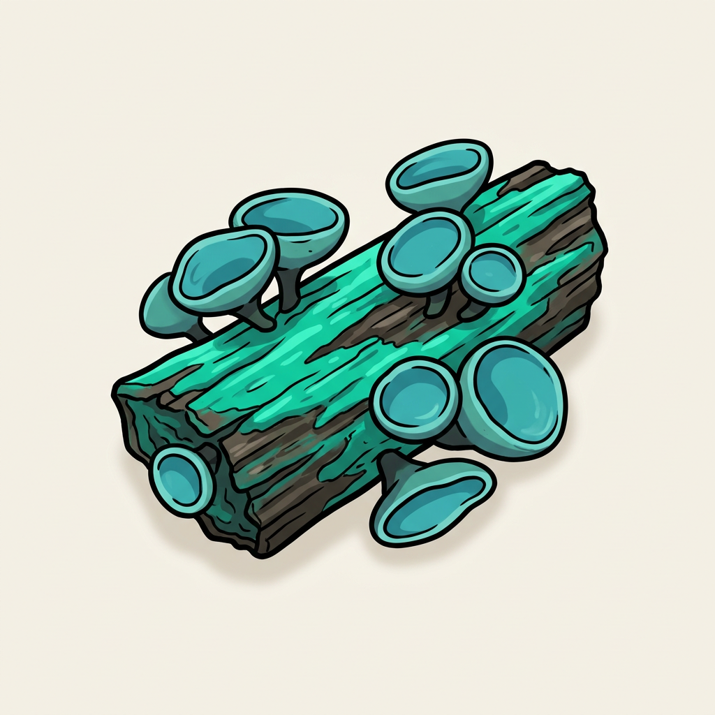 Tiny (3-5 mm) turquoise cup fungus that dyes the wood it inhabits bright GREEN — famously used in Tunbridge Ware marquetry for centuries before the industrial blue-green dye was manufactured.