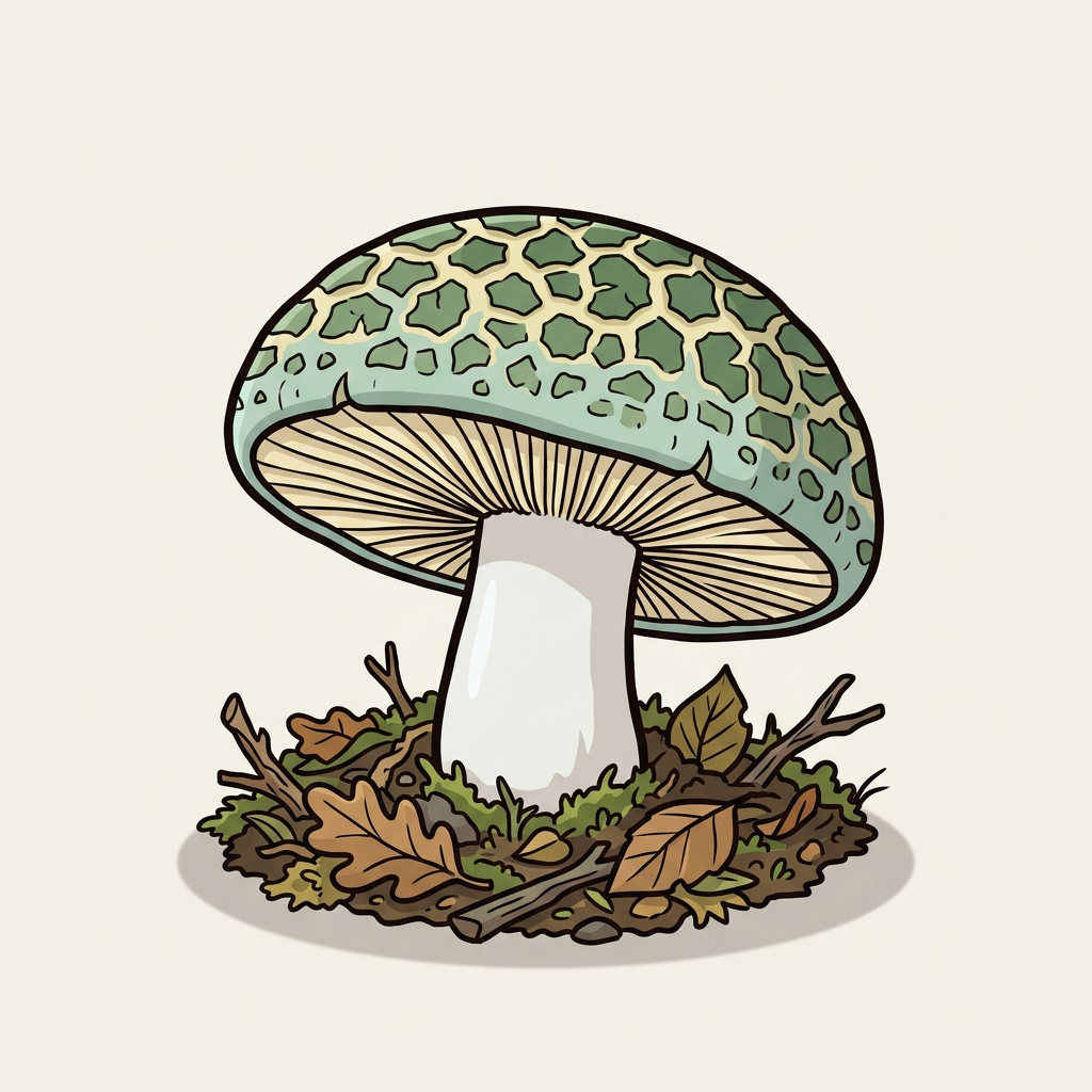 Sage-green to blue-green cap with patchwork cracking surface — looks like crazed ceramic. Mild taste. One of the most commonly eaten green mushrooms in Europe and Asia.