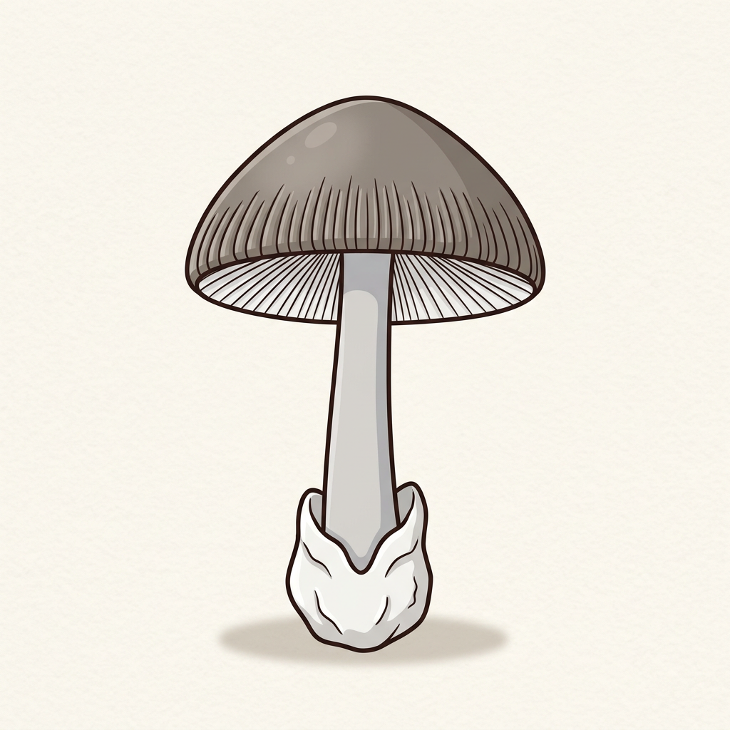 Slender gray-brown Amanita with a striate (grooved) cap edge, NO ring on the stem, and a conspicuous sack at the base. Edible when well-cooked, but dangerous due to family confusion with deadly Amanitas.