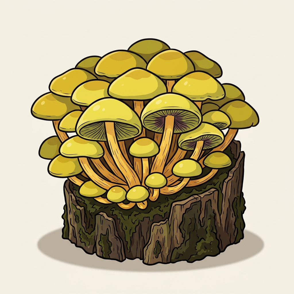Honey-colored mushrooms in dense clusters at the base of trees. Notorious tree killer — produces the largest organism on Earth via underground rhizomorph networks (a single Oregon Armillaria covers 3.4 square miles). Must be thoroughly cooked.