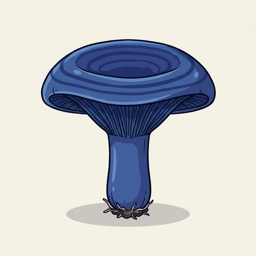 Striking indigo-BLUE mushroom — cap, gills, and stem all blue. Exudes BLUE latex when cut. Firm crunchy texture; mild sweet flavor. Turns silvery-gray when cooked.