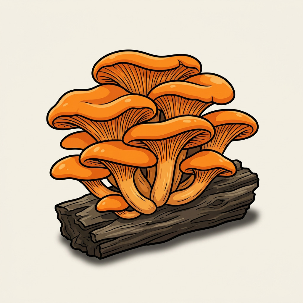 Orange to pumpkin-colored gilled mushroom fruiting in dense clusters at the base of hardwood stumps. Gills glow faintly green in the dark (fresh specimens). Toxin illudin S causes severe vomiting, diarrhea, and cramping — not deadly but spectacularly unpleasant.