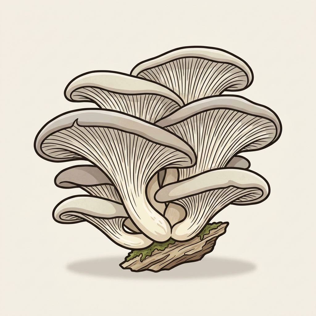 Oysters have WHITE-TO-CREAM caps with gills running DOWN the short stem, growing as SHELVES on wood. Jack-o-lanterns are BRIGHT ORANGE and grow in ROUND CLUSTERS at tree bases, not shelf-like.