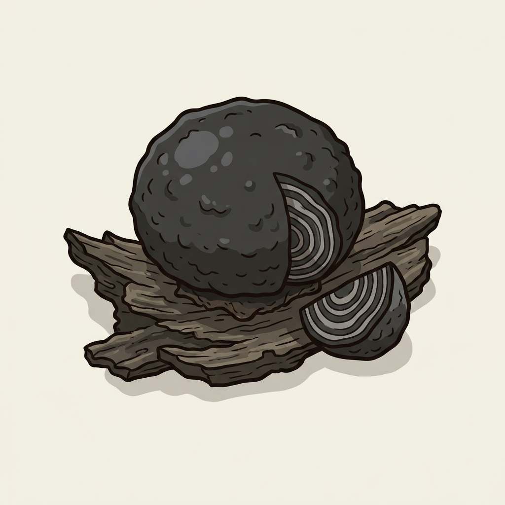 "Little black charcoal-looking balls on dead ash. Split one open — concentric rings like a stone."