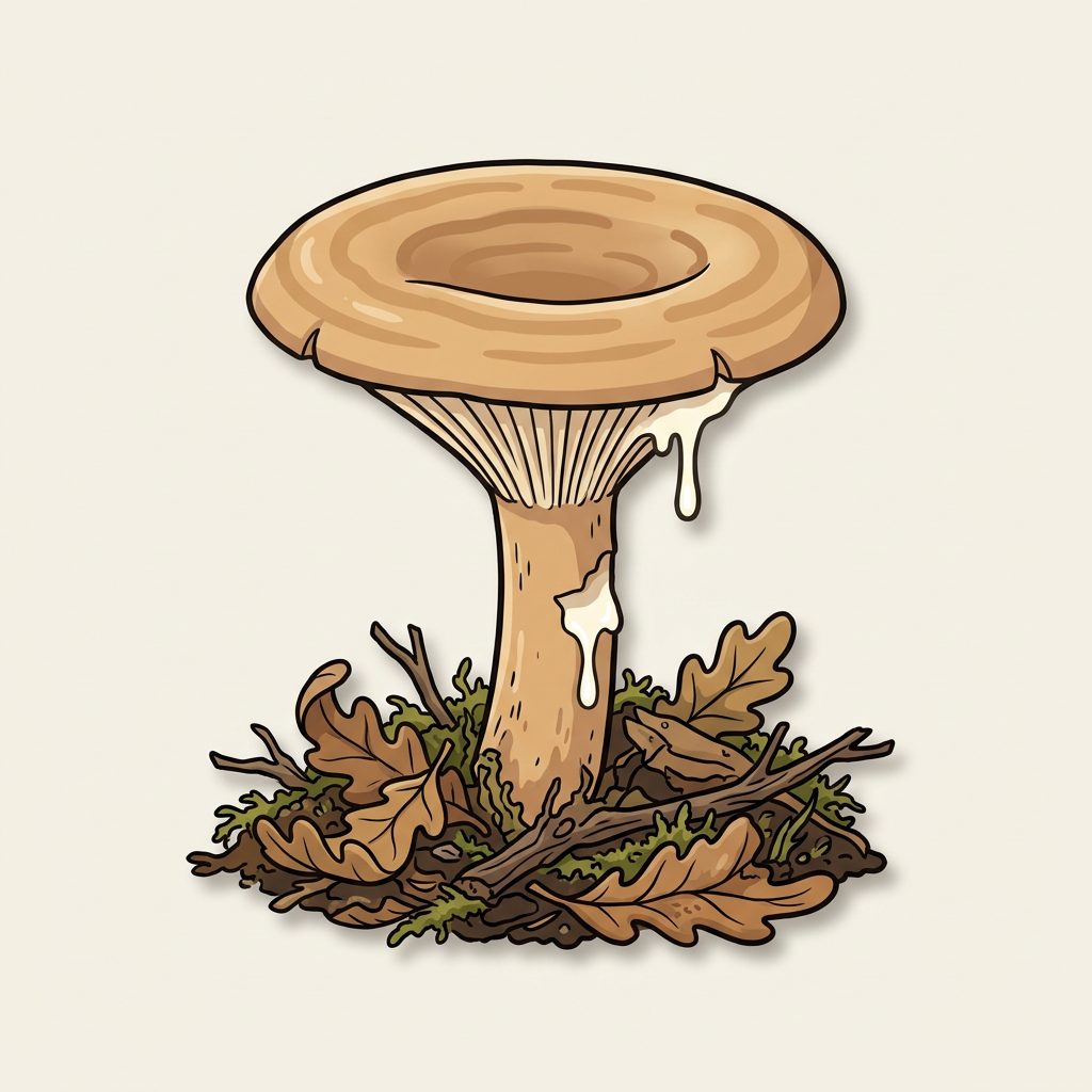 Brownish milk cap specific to oak hosts. Oily / bedbug-like smell. Exudes whitish latex. Not prized but safe to eat when properly cooked.