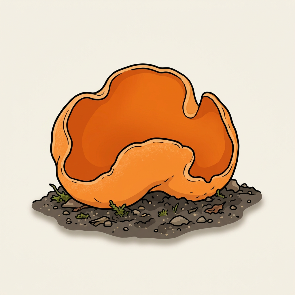 Bright orange cup fungus that exactly resembles discarded orange peel on soil. Delicate; hard to cook without falling apart. Pretty rather than practical.