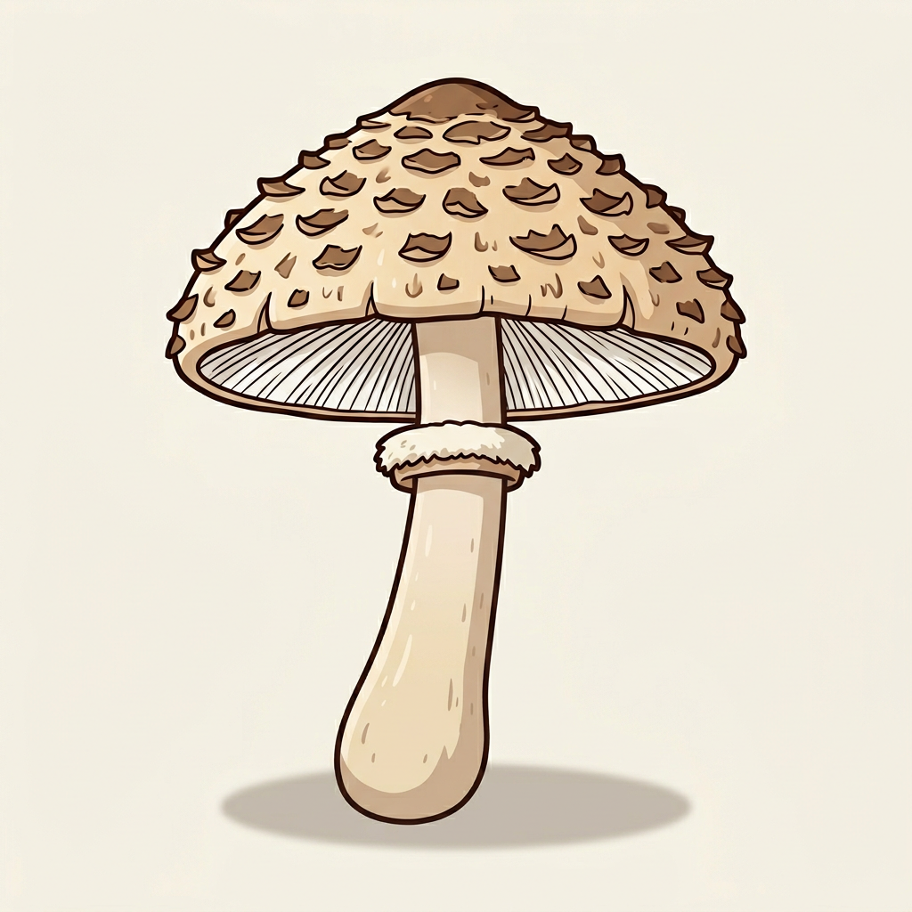 Large scaly-capped lawn mushroom similar to parasol but without the snakeskin stem. Causes GI upset in a minority of people — test with a small portion first. Flesh turns pink-orange when cut.