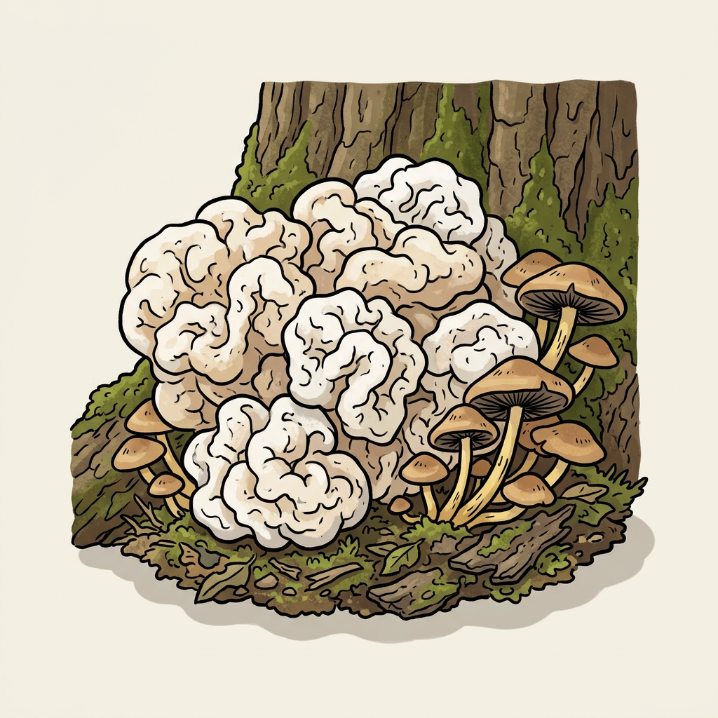 "Lumpy white distorted puffs alongside honey mushrooms. Parasitic failure. Actually tastes like shrimp."