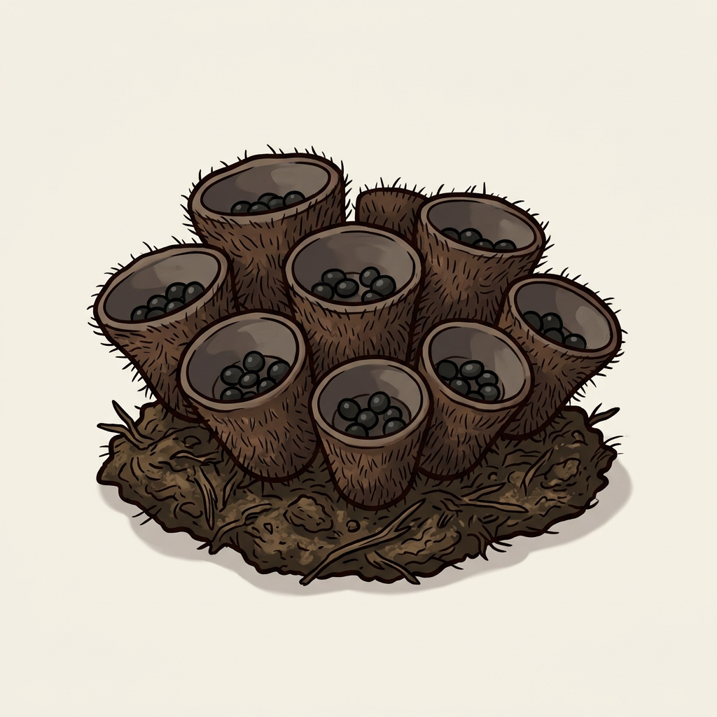 "Smaller cousin to the common bird's-nest. Grows on dung. Same spore-splash mechanism."