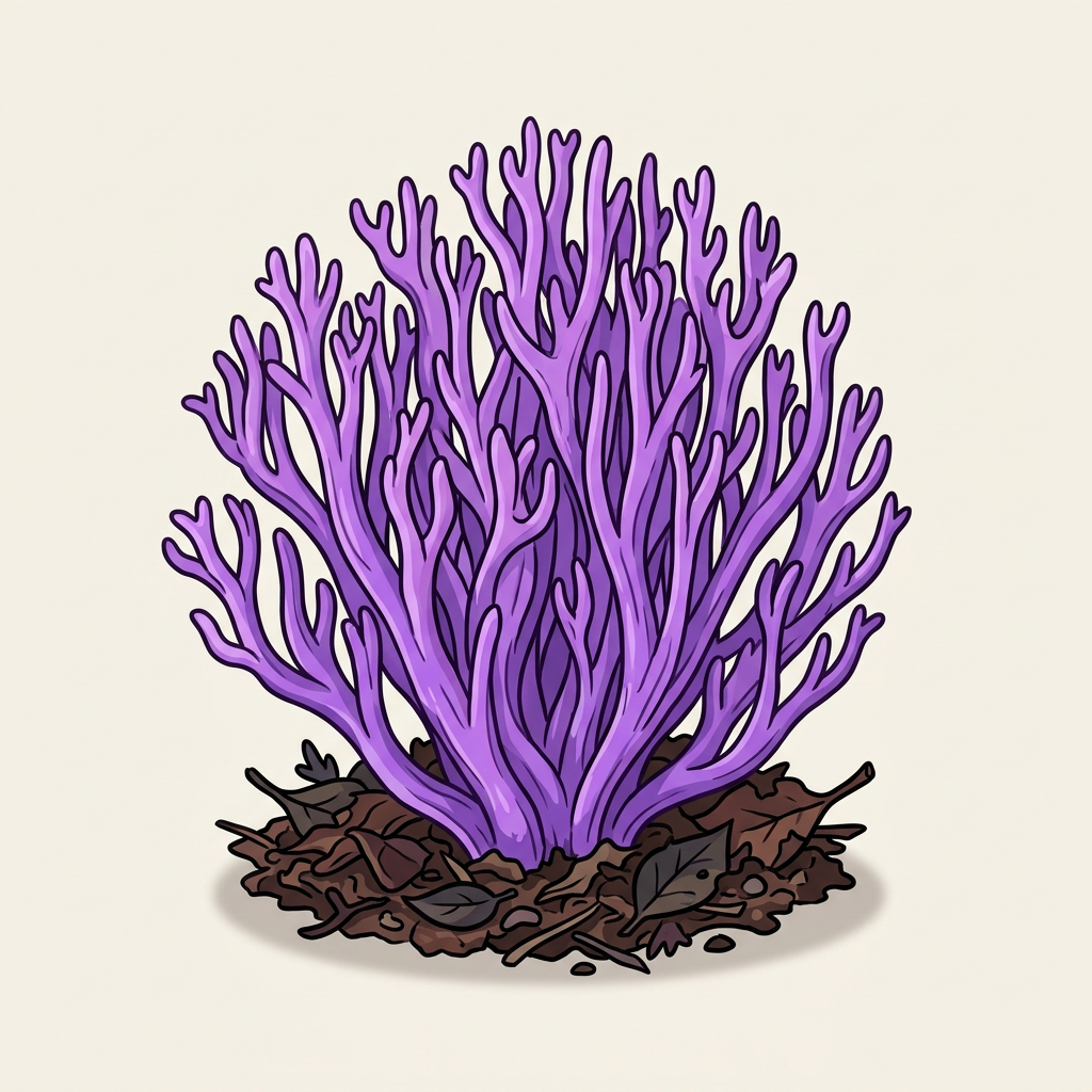 "Electric violet branched coral rising from leaf duff. Pure visual joy. Too small and fibrous to eat."