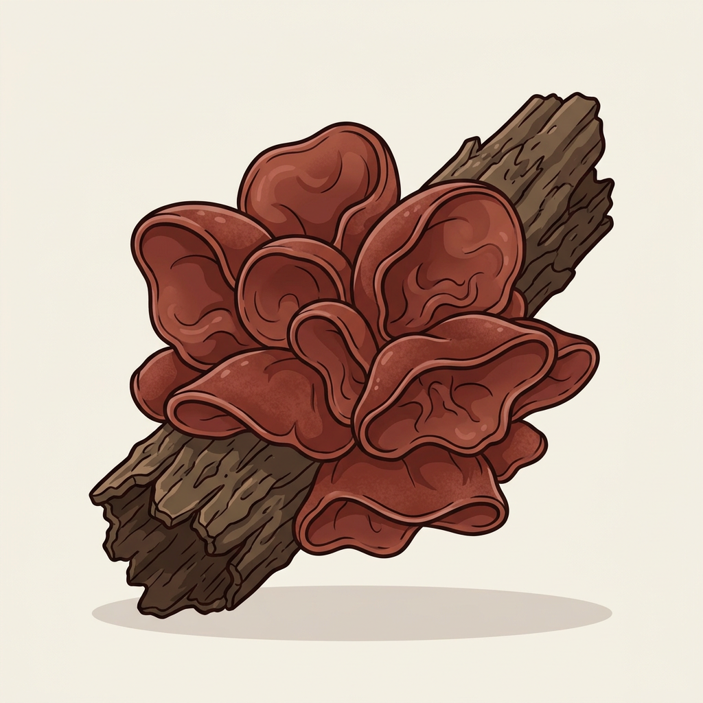 Brown to dark red-brown jelly fungus shaped like human ears. Rubbery texture. Widely used in Chinese cuisine — hot-and-sour soup, mu shu pork. Dried rehydrates perfectly.