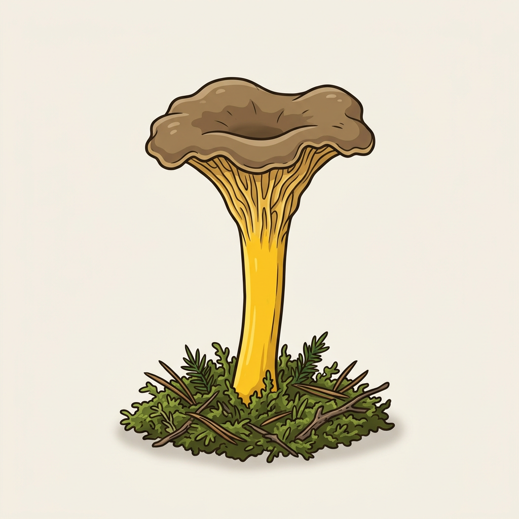 Small trumpet-shaped chanterelle-relative with brown cap and bright yellow hollow stem. Late-season — fruits into early winter. Forms large mossy colonies. Winter chanterelle / funnel chanterelle / yellowfoot.