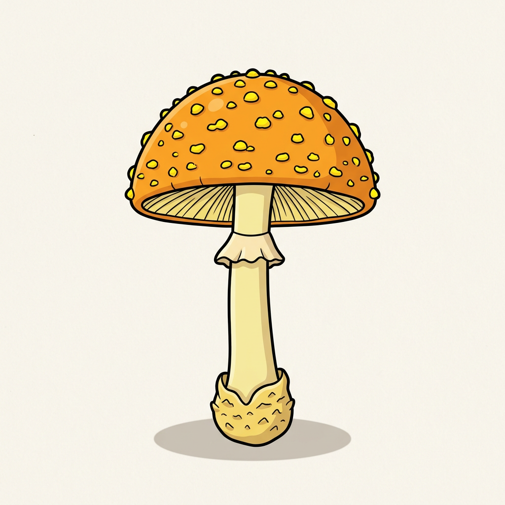 Small to medium Amanita with bright yellow-orange cap and bright yellow warty patches. Common in eastern North American hardwoods. Considered inedible with potentially toxic compounds.